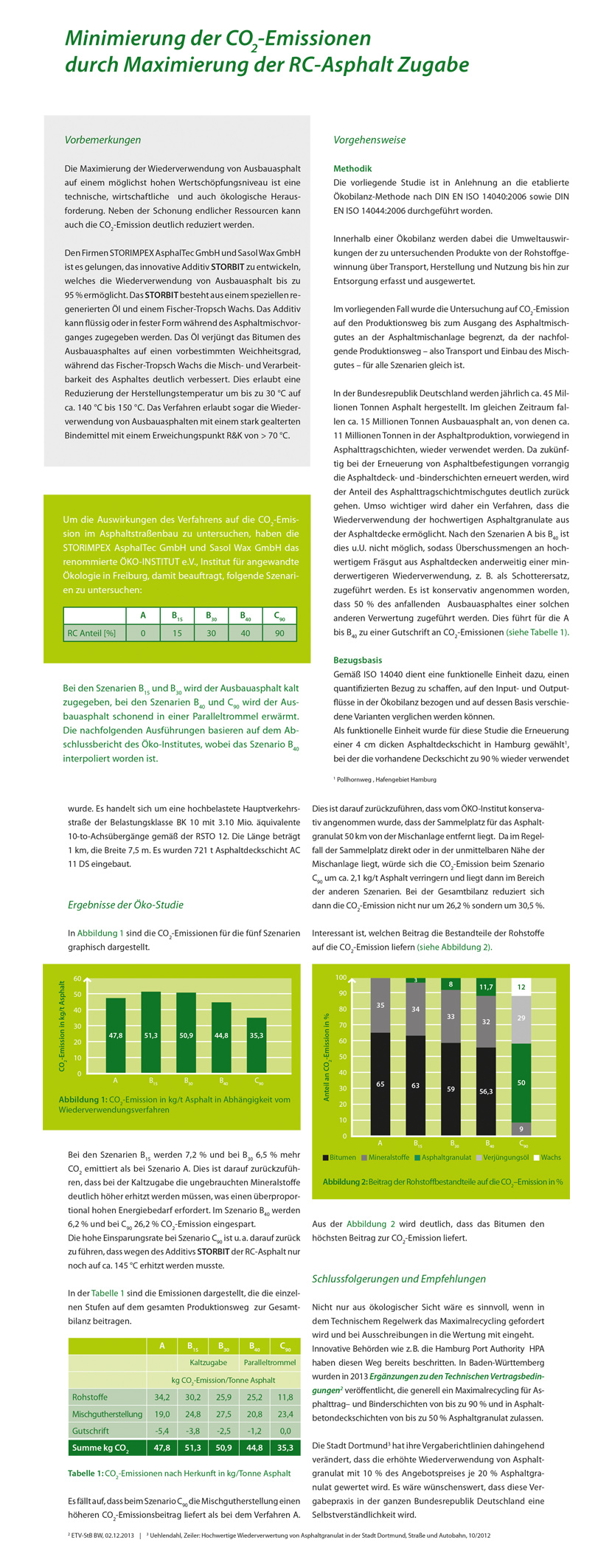 Unsere Additive für das Maximalrecycling sind für die höchstmögliche Wiederverwendung von Ausbauasphalt entwickelt worden und erlauben eine Wiederverwendungsrate von Asphaltgranulat bis zu 95 %. Alle STORBIT Produkte basieren auf einer Mischung unserer STORFLUX Rejuvenatoren mit Fischer-Tropsch Wachsen der Sasol Wax GmbH.